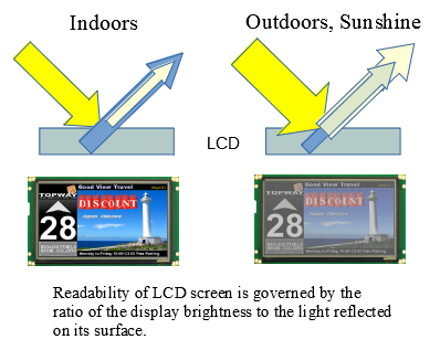To be readable in an outdoor environment with very bright ambient light, the brightness of the LCD screen must be greater than the intensity of light reflected from the display surface. To be viewed comfortably by human eyes, the LCD's brightness must exceed its reflected light by at least a factor of 2.5. Naturally, there are two approaches to making an LCD sunlight-readable: increasing brightness or decreasing reflectance.